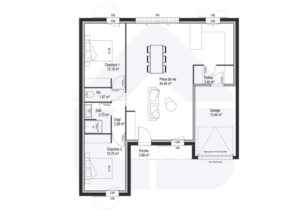 Maison de 80 m² habitables composée de 2 chambres. Ce projet est idéal pour les terrains à faible largeur. La pièce de vie est traversante, permettant ainsi de bénéficier d’une double exposition solaire. La cuisine, légèrement en retrait, offre de nombreuses possibilités d’aménagement.