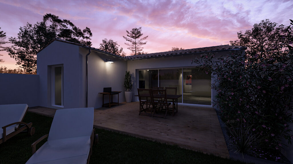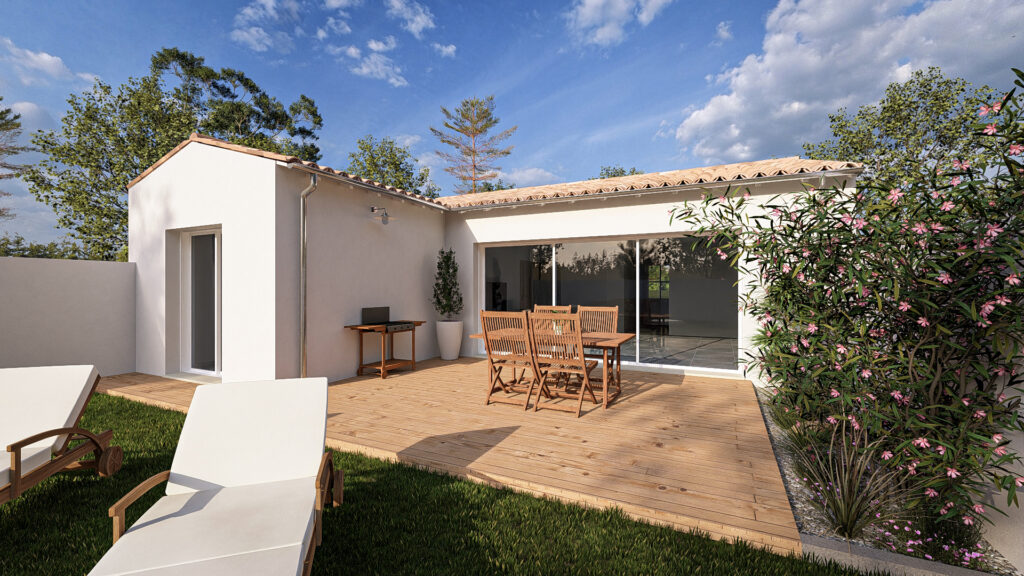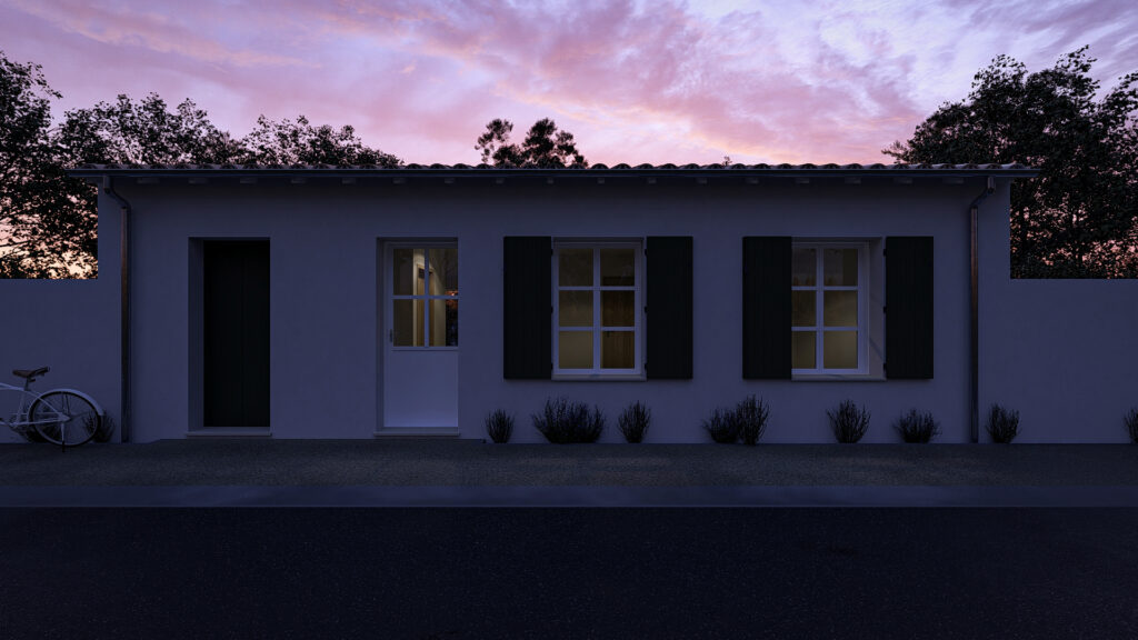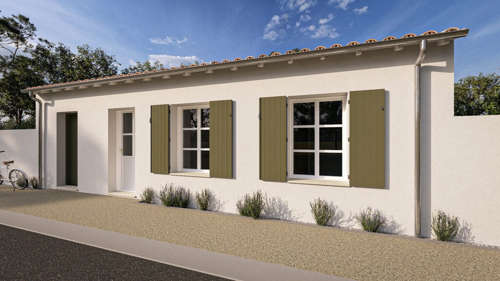 Cette maison de plain-pied présente un plan en L, optimisé pour une vie familiale. Elle dispose d’une grande pièce de vie ouverte regroupant salon, salle à manger et cuisine, baignée de lumière grâce à de larges ouvertures sur l’extérieur. L’espace nuit se divise en deux zones : une suite parentale avec salle d’eau et dressing dans l’aile gauche, et deux chambres supplémentaires accompagnées d’une salle de bain et d’un WC dans l’aile droite. Un cellier complète la partie cuisine, offrant du rangement. L’ensemble est compact, fonctionnel et confortable.