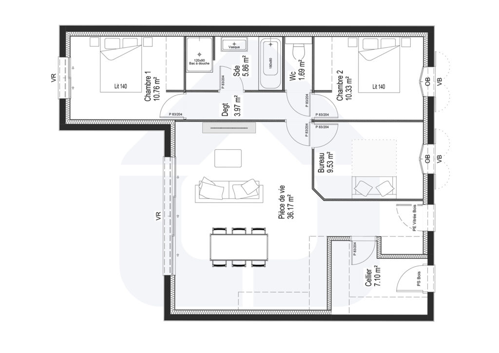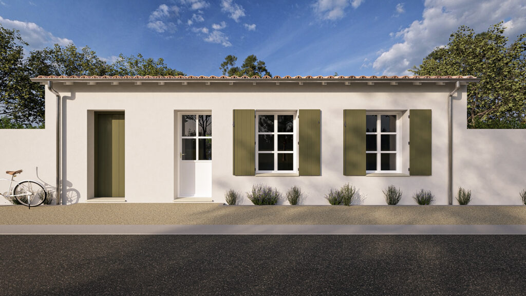 Cette maison de plain-pied présente un plan en L, optimisé pour une vie familiale. Elle dispose d’une grande pièce de vie ouverte regroupant salon, salle à manger et cuisine, baignée de lumière grâce à de larges ouvertures sur l’extérieur. L’espace nuit se divise en deux zones : une suite parentale avec salle d’eau et dressing dans l’aile gauche, et deux chambres supplémentaires accompagnées d’une salle de bain et d’un WC dans l’aile droite. Un cellier complète la partie cuisine, offrant du rangement. L’ensemble est compact, fonctionnel et confortable.