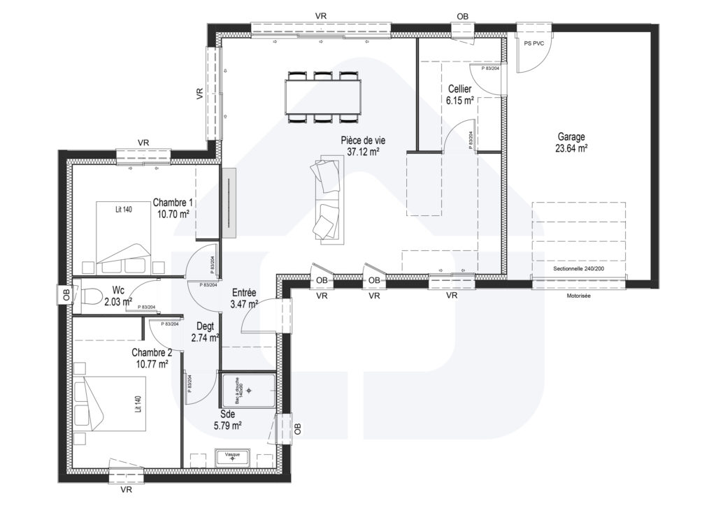 Cette maison de plain-pied offre une organisation fluide et fonctionnelle, pensée pour le confort au quotidien. Elle s’articule autour d’une grande pièce de vie ouverte et lumineuse, regroupant salon, salle à manger et cuisine, avec un accès direct au cellier. L’espace nuit comprend deux chambres, une salle d’eau spacieuse et des WC indépendants, bien séparés de la zone jour. Un garage généreux et une entrée bien définie complètent l’ensemble, pour une maison pratique et agréable à vivre.
